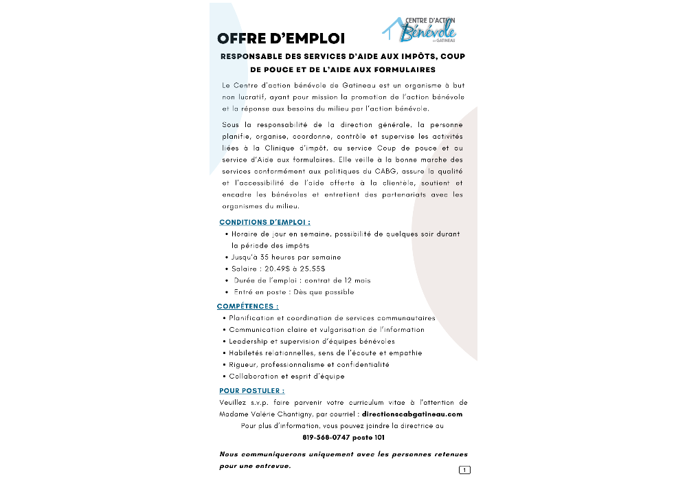 Offre d’emploi - responsable des services d’aide aux impôts, Coup de pouce et aide aux formulaires